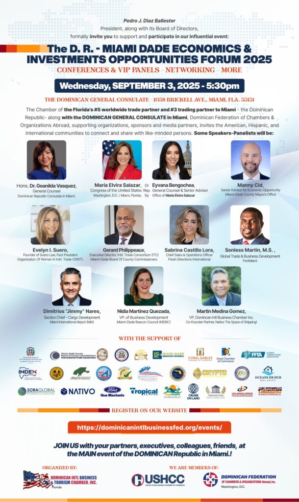 Miami, Florida. Septiembre 2, 2025.- La Cámara Dominicana Internacional de Negocios y Turismo, en su 32vo año de fundada, organiza el “Primer Foro Oportunidades Económicas y de Inversión entre el Condado Miami-Dade y la República Dominicana 2025”, a realizarse este miércoles 3 de septiembre en la sede del Consulado General de la República Dominicana, ubicado en Brickell Avenue Miami, iniciando con un networking a las 5:30 pm., continuando con el Forum, y segunda parte del networking, hasta las 7:30 p.m.